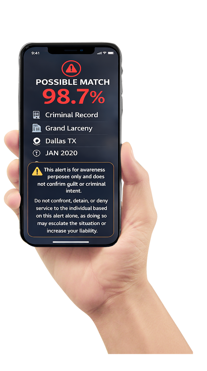 Your store will instantly be connected to our robust 180 million criminal record database and the ever-growing Digital Bodyguard Watchout list built by your fellow jewelers and pawnshops.